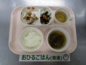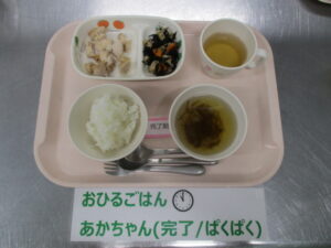 ★2/13(月)★今日の給食・おやつ 2023/02/13 ★幼児★ 〈メニュー〉 ご飯、鶏肉の味噌焼き、ひじきの含め煮、もずくのすまし汁 ———————————————————- ★離乳食★ 〈メニュー〉 【中期食】提供なし 【完了食】軟飯、鶏肉の味噌焼き、ひじきの含め煮、もずくのすまし汁 ===================================== 【おやつ】 〈メニュー〉 【後期食以降】牛乳、チーズおやき