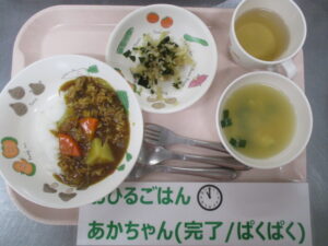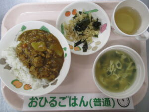 カレーライス、切干大根とわかめのサラダ、かきたまスープ