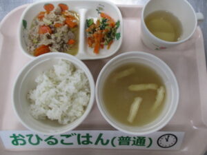 麦ごはん、豚肉と白菜のとろみ炒め、ツナと小松菜の和え物、大根と油揚げの味噌汁