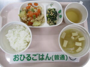 ご飯、鶏肉じゃが、納豆和え、高野豆腐の味噌汁