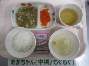 【中期食】五倍粥、高野豆腐となすの煮物、人参煮、もやしの味噌汁