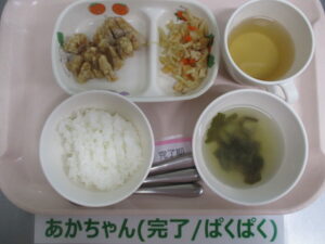 【完了食】軟飯、鶏の竜田揚げ、切干大根の煮つけ、茄子とわかめの味噌汁