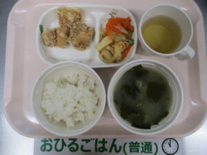 麦ごはん、鶏の竜田揚げ、切干大根の煮つけ、茄子とわかめの味噌汁