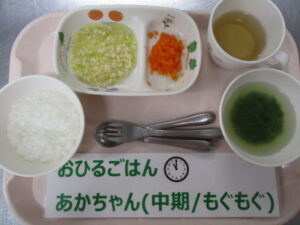 【中期食】五倍粥、高野豆腐とキャベツの煮物、人参煮、ほうれん草の味噌汁