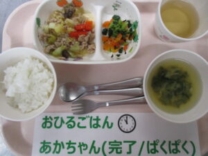 【完了食】軟飯、肉の焼肉炒め、磯香和え、ほうれん草と長ねぎの味噌汁
