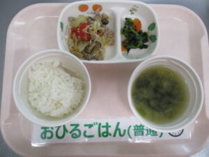 ご飯、豚肉の焼肉炒め、磯香和え、ほうれん草と長ねぎの味噌汁