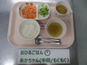 【中期食】五倍粥、鮭と人参の煮物、ブロッコリー煮、玉ねぎのスープ