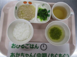 【中期食】五倍粥、鶏ひき肉と玉ねぎの煮物、小松菜煮、いんげんのすまし汁