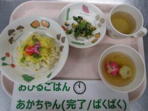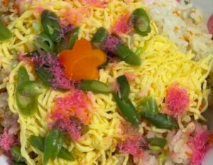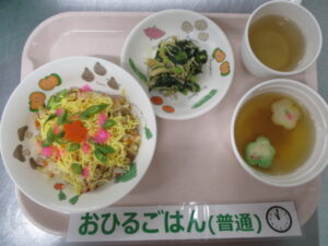 ちらし寿司、千草和え、花麩と玉ねぎのすまし汁