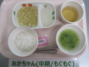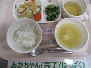 【中期食】五倍粥、豆腐と玉ねぎの煮物、大根煮、小松菜の味噌汁