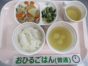 ご飯、豚肉とがんもの旨煮、小松菜ともやしのごま和え、豆腐と玉ねぎの味噌汁