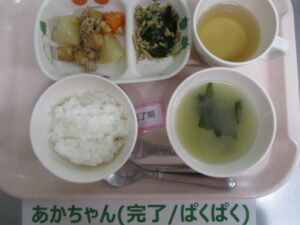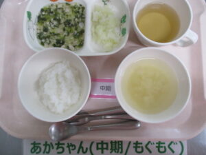 【中期食】五倍粥、鶏ひき肉と小松菜の煮物、じゃが芋煮、大根の味噌汁