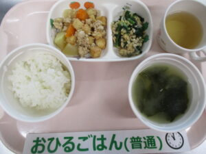 ご飯、厚揚げと大根のそぼろ煮、納豆和え、わかめとじゃが芋の味噌汁