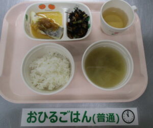 麦ごはん、白身魚のオニオンソースがけ、ひじきの含め煮、玉ねぎとしめじの味噌汁