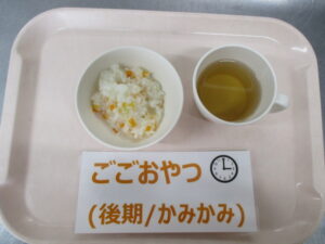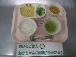 【後期食】五倍粥、高野豆腐と玉ねぎの煮物、きゅうり煮、キャベツの味噌汁