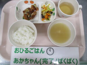 【後期食】五倍粥、鶏ひき肉と人参の煮物、白菜煮、玉ねぎの味噌汁