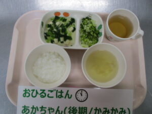 【後期食】五倍粥、高野豆腐と小松菜の煮物、ブロッコリー煮、玉ねぎのスープ