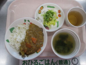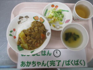 カレーライス、コーンとチーズのサラダ、小松菜としめじのスープ