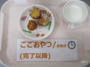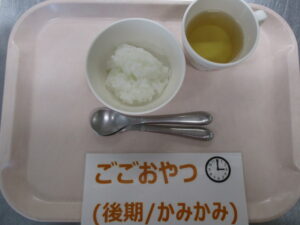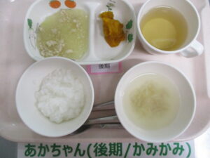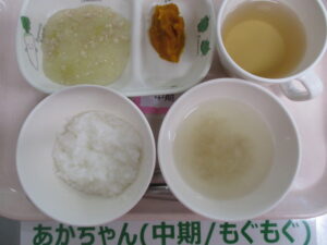 【中期食】五倍粥、鶏ひき肉とたまねぎの煮物、かぼちゃ煮、もやしの味噌汁