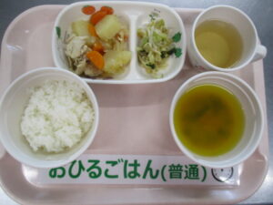 ご飯、鶏肉じゃが、チンゲン菜ともやしのナムル、かぼちゃの味噌汁