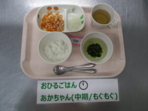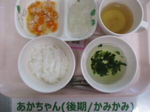 【中期食】五倍粥、鮭と人参の煮物、大根煮、ほうれん草のすまし汁