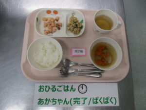 【完了食】軟飯、鮭の照り焼き、納豆和え、けんちん汁