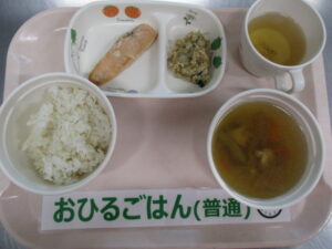 麦ごはん、鮭の照り焼き、納豆和え、けんちん汁