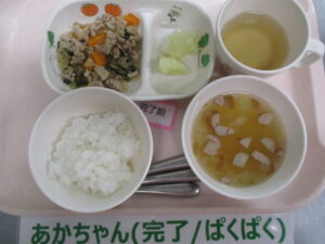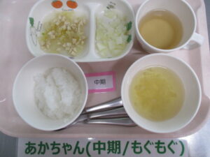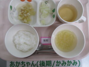 【中期食】五倍粥、高野豆腐と白菜の煮物、じゃが芋煮、玉ねぎのスープ