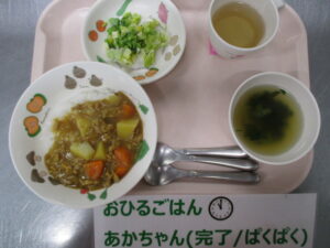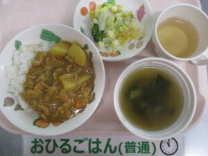 カレーライス、コーンとチーズのサラダ、小松菜としめじのスープ