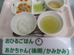 【中期食】五倍粥、鶏ひき肉と人参煮、キャベツ煮、玉ねぎのスープ