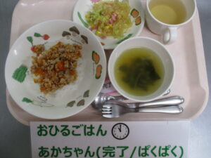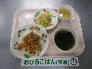 人参鶏そぼろ丼、バンサンスー、わかめスープ