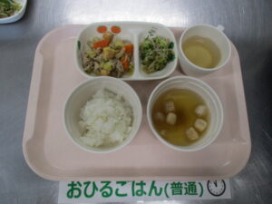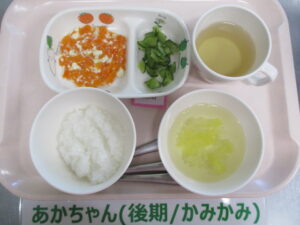 【後期食】五倍粥、豆腐と人参の煮物、きゅうり煮、白菜のすまし汁