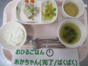 【完了食】軟飯、シュウマイ風、キャベツともやしのカレーソテー、小松菜と人参のスープ