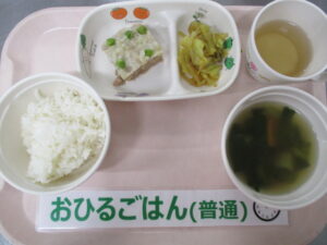 ご飯、シュウマイ風、キャベツともやしのカレーソテー、小松菜と人参のスープ