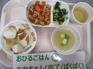 ロールパン、鶏肉のトマト煮、ほうれん草とコーンのソテー、豆腐のスープ
