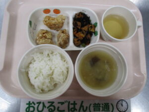 ご飯、鶏のから揚げ、ひじきの含め煮、なすと玉ねぎの味噌汁