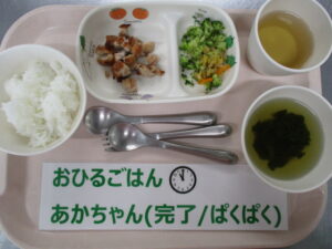 【完了食】軟飯、バーベキューチキン、白菜とブロッコリーのお浸し、ほうれん草とごぼうのすまし汁