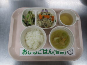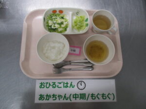 【中期食】五倍粥、豆腐と小松菜の煮物、キャベツ煮、もやしのすまし汁