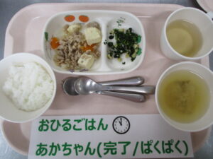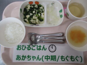 【中期食】五倍粥、豆腐とほうれん草の煮物、大根煮、人参の味噌汁