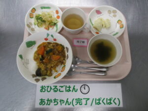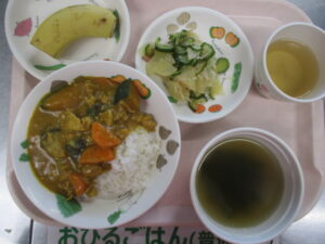 〈メニュー〉なすとかぼちゃのカレーライス、カニカマサラダ、わかめスープ、バナナ