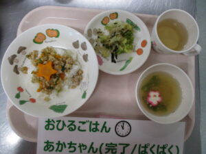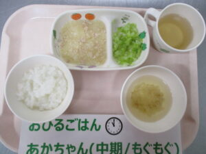 【中期食】五倍粥、鶏ひき肉と玉ねぎの煮物、キャベツ煮、もやしのすまし汁