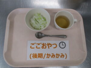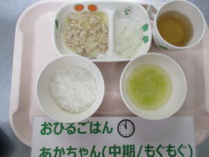 【中期食】五倍粥、鶏ひき肉と玉ねぎの煮物、大根煮、白菜の味噌汁