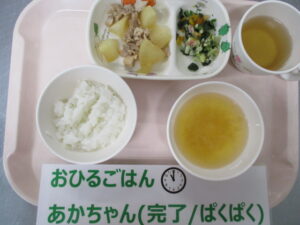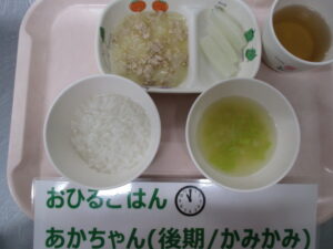 【後期食】五倍粥、鶏ひき肉と玉ねぎの煮物、大根スティック、白菜の味噌汁