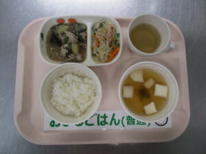 〈メニュー〉麦ごはん、豚肉となすの味噌炒め、春雨サラダ、はんぺんのすまし汁