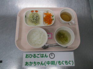 【中期食】五倍粥、しらすと玉ねぎの煮物、人参煮、なすのスープ