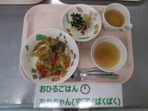 〈メニュー〉夏野菜カレーライス、切干大根とわかめのサラダ、かまぼこのスープ