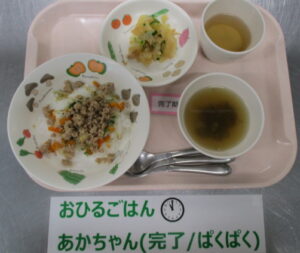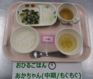 【中期食】五倍粥、ツナとほうれん草の煮物、大根煮、もやしのスープ