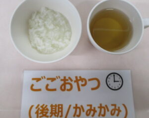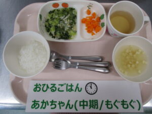 【中期食】五倍粥、白身魚の小松菜の煮物、人参煮、高野豆腐の味噌汁