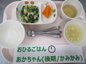 【後期食】五倍粥、白身魚の小松菜の煮物、人参煮、高野豆腐の味噌汁