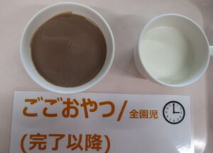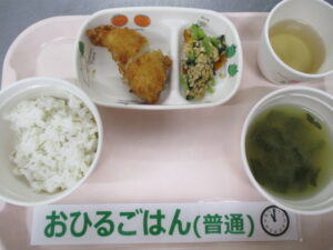 麦ごはん、白身魚のフライ、小松菜の納豆和え、高野豆腐の味噌汁